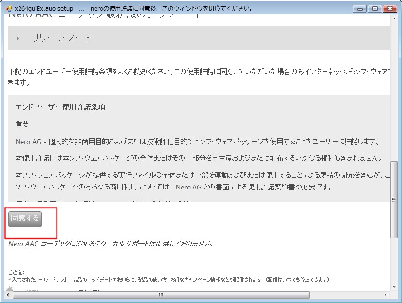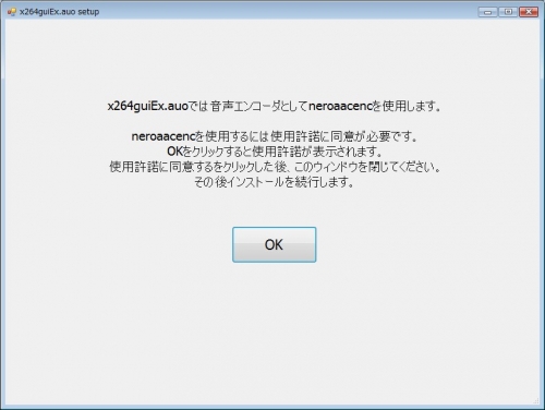 これは、拡張 x264 出力(GUI) Exで使う、音声のエンコーダの使用に同意して下さいと促すメッセージです。