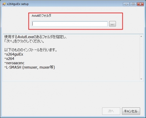 AviUtlの本体のあるフォルダを指定して、次へ進みます。