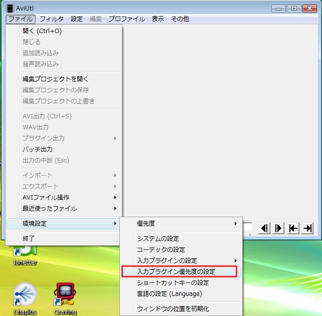 上のように、AviUtlのファイルメニューから、環境設定を開いて、