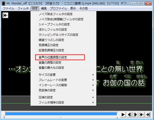 音声位置の修正は、AviUtlの設定メニューから、音声の位置調整の設定をクリックします。