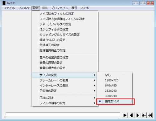 画面サイズの設定は、AviUtlの設定メニューから、サイズの変更の中の指定サイズをクリックして行います。