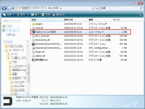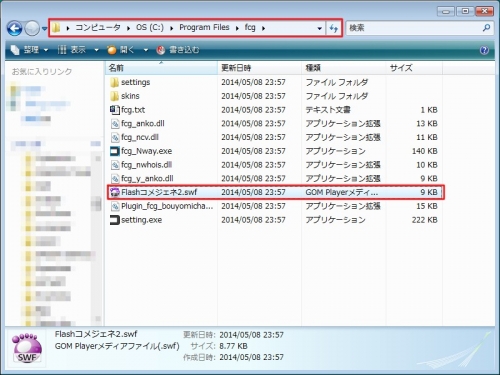 赤枠の「Flashコメジェネ2.swf」ファイルを見つけましょう。