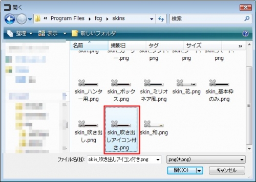 コンピューター>OS(C:)>Program Files>fcg>skins のフォルダの中にあります。